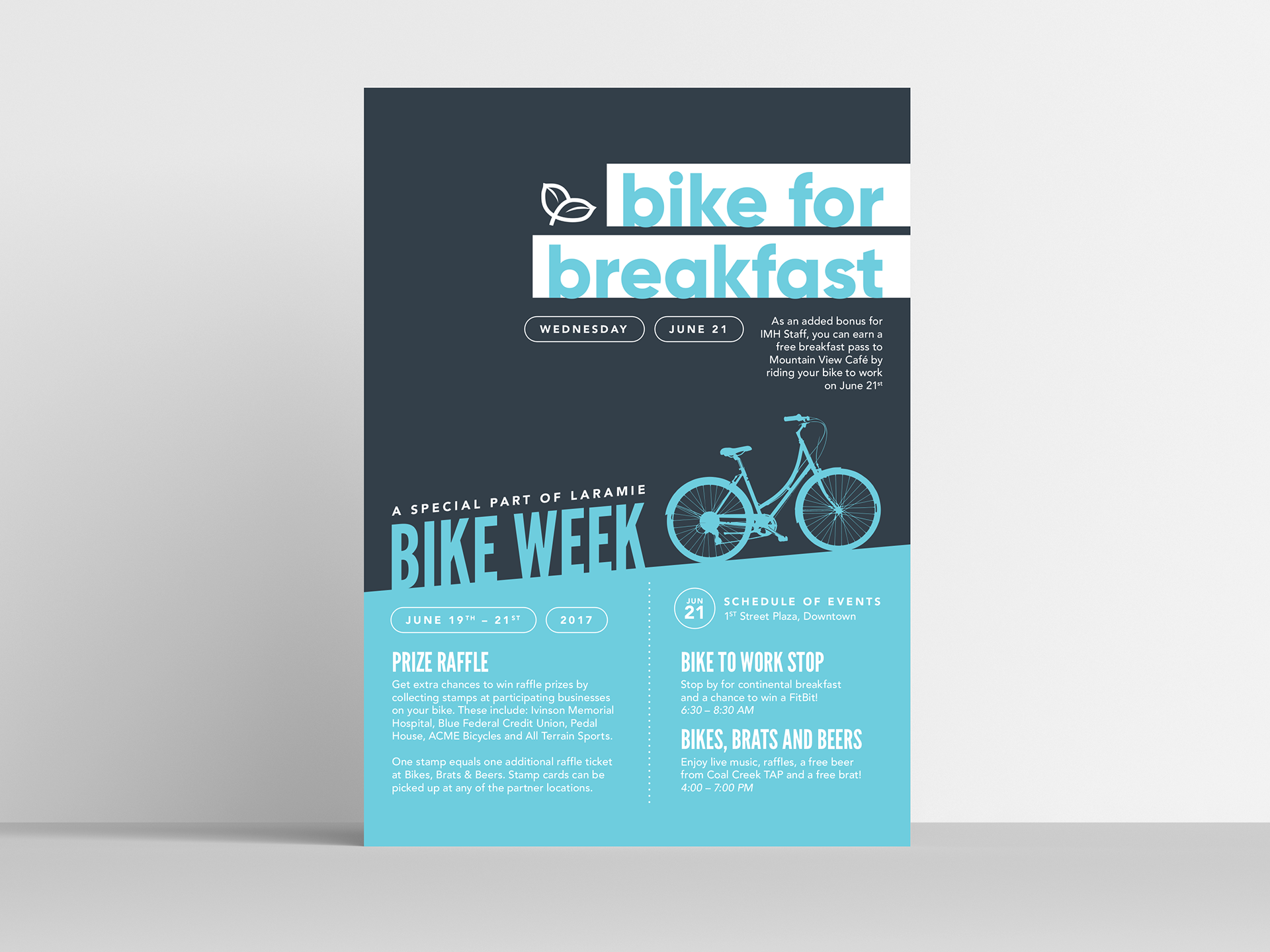 A poster I created to promote a summer wellness initiative at the hospital. As part of the initiative, employees were encouraged to ride their bike to work instead of driving, and could earn a free breakfast for doing so.