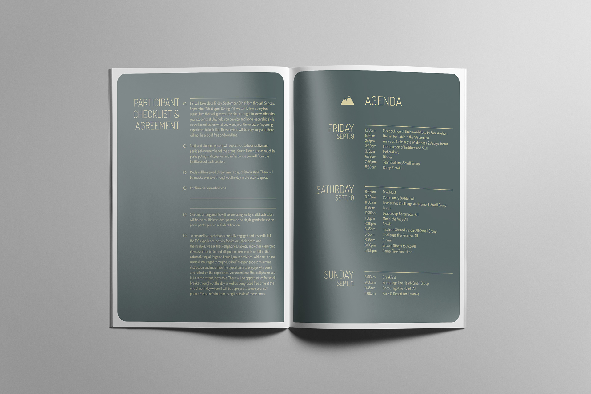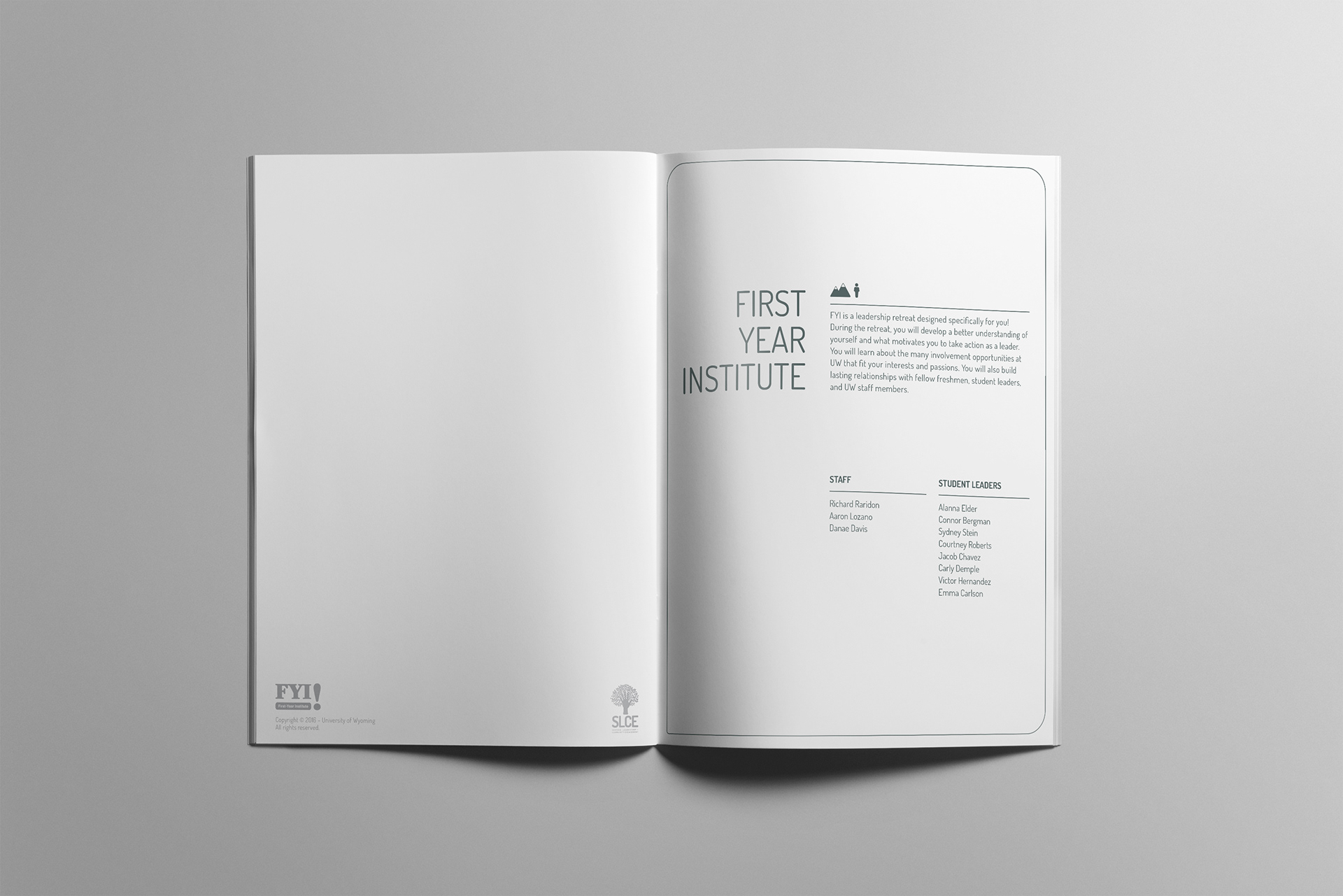 A booklet I created for the University of Wyoming SLCE Office's First Year Institute. First Year Institute, or FYI for short, is a weekend retreat for incoming freshmen to learn and develop good leadership skills as they enter college.