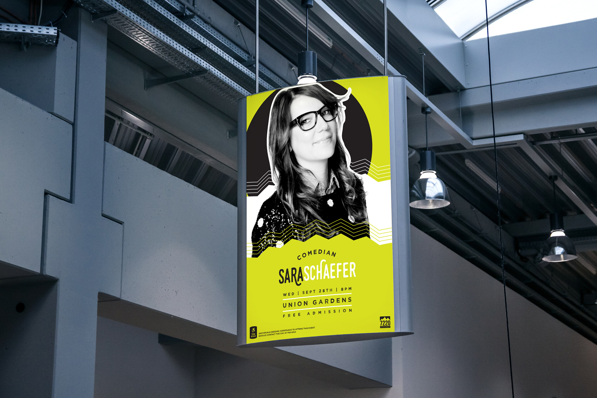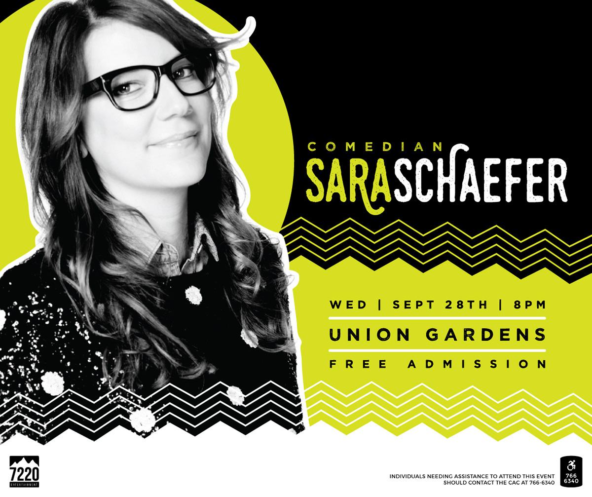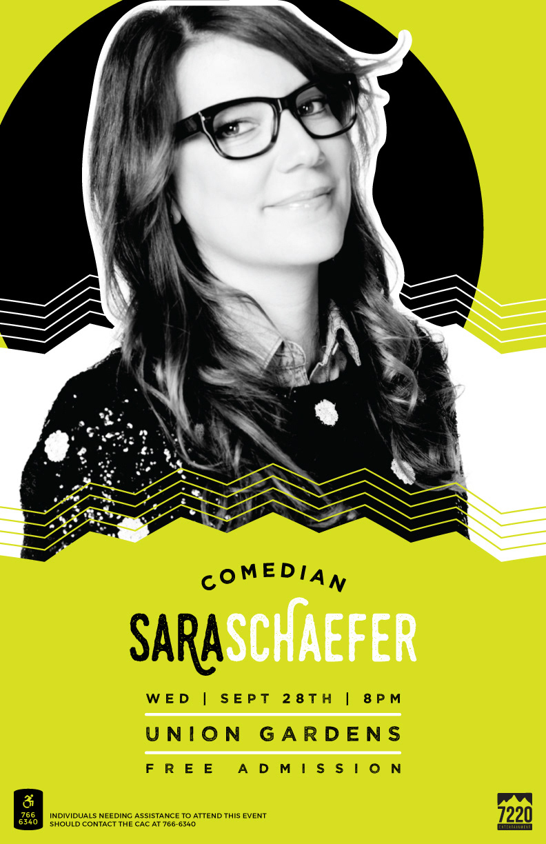 Comedian Sara Schaefer will be visiting the University of Wyoming at the end of September. This the poster I designed to promote this event, which will be held in the Gardens of the Wyoming Union.