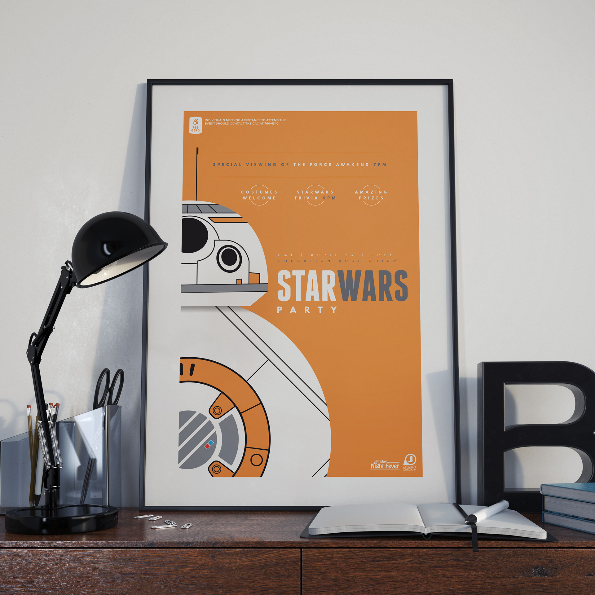 A poster I designed to promote an event at the University of Wyoming. Students were invited to attend a special screening of the film Star Wars: The Force Awakens. Students who dressed up as their favorite Star Wars character were eligible to win awesome Star Wars themed prizes!