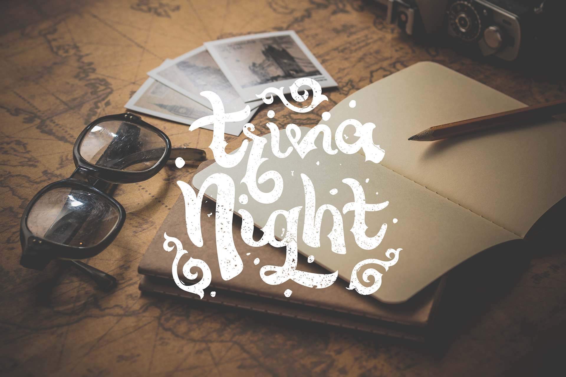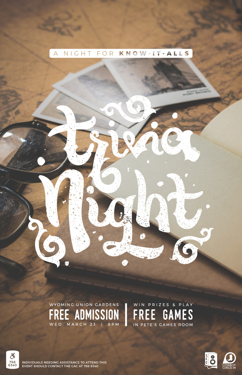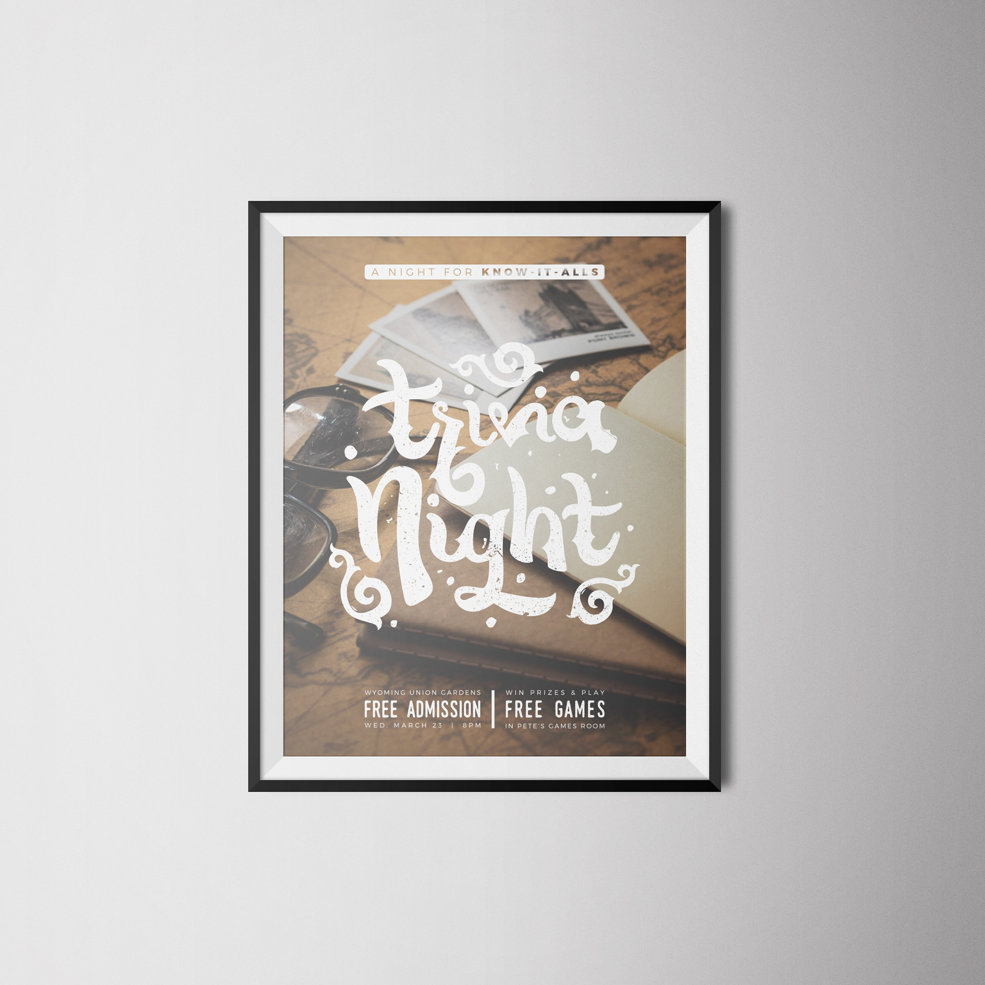 A poster I designed to promote an upcoming Trivia Night in the Wyoming Union. For this poster, I created the lettering for the main title myself using Sharpies and a Pilot Parallel pen.